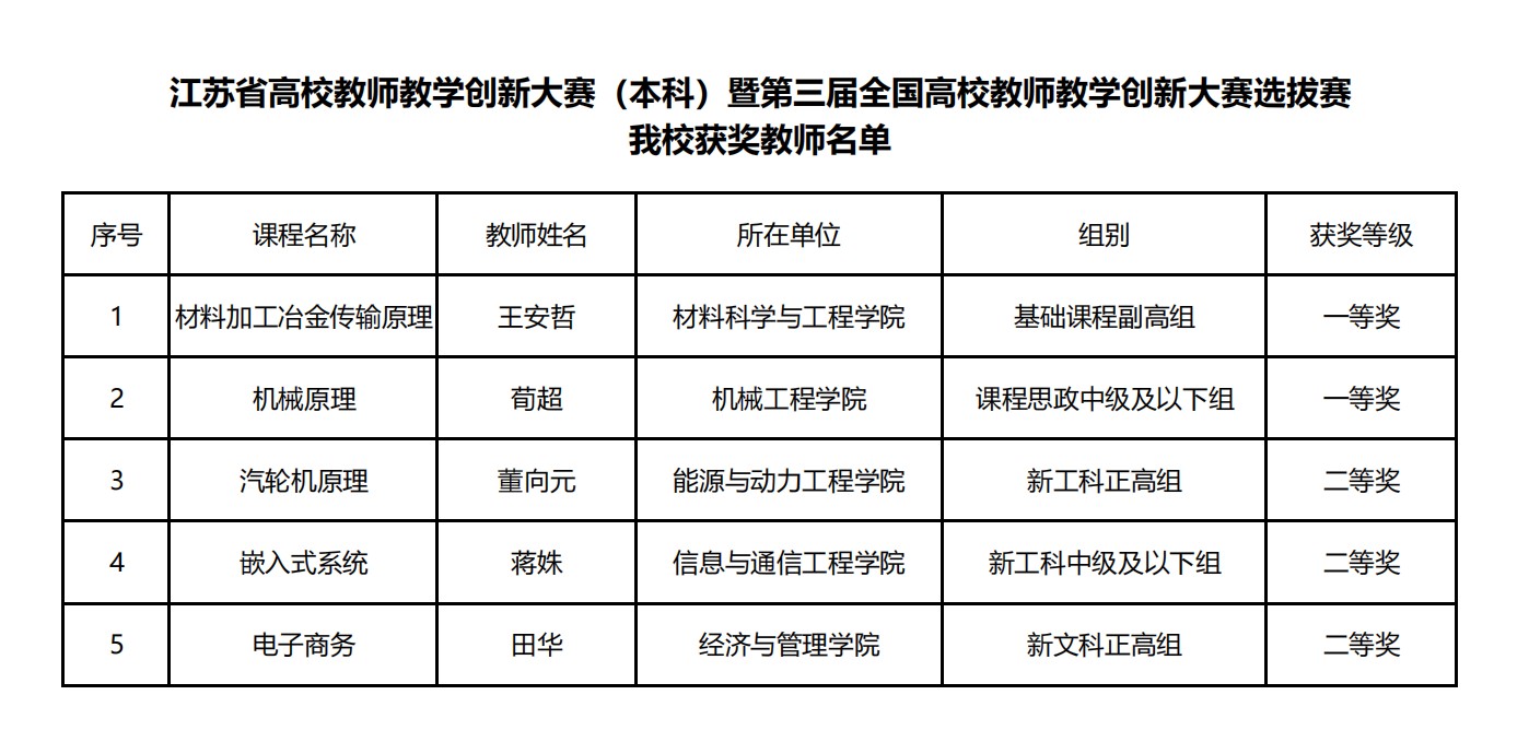 近日,江苏省高校教师教学创新大赛(本科)暨第三届全国高校教师教学创新大赛选拔赛决赛在南京航空航天大学落下帷幕。我校共6门课程参赛,其中2门课程入围决赛,最终机械凯发荀超老师及其团队,材料科学与凯发王安哲老师及其团队在各自组别中荣获大赛一等奖;能源与动力凯发董向元老师团队、信息与通信凯发蒋姝老师团队、经济与管理学院田华老师团队荣获大赛二等奖。