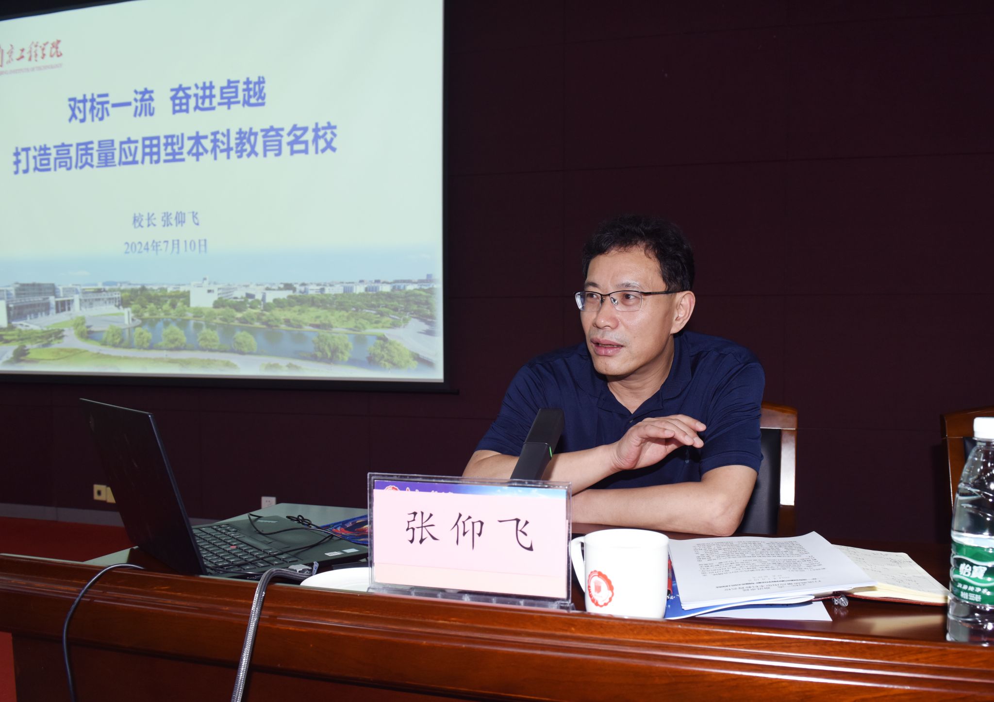 张仰飞作活动总结,并以《对标一流 奋进卓越 打造高质量应用型本科教学名校》为题作专题报告。他从“建设基础与条件、建设目标与思路、建设任务与举措、建设进度与成效”四个方面深刻解读了我校一流应用型本科高校建设方案,并从“高等教育的思考、教师职业的思考、办学主体的思考、职能部门的思考”四个角度分享了对本科教育教学工作的思考,重点分享了教师的职业观、政治观、德行观、能力观、学生观、成才观、国际观,引导和推动广大领导干部和全体教职员工进一步统一思想、凝聚共识、汇聚合力、共谋发展。