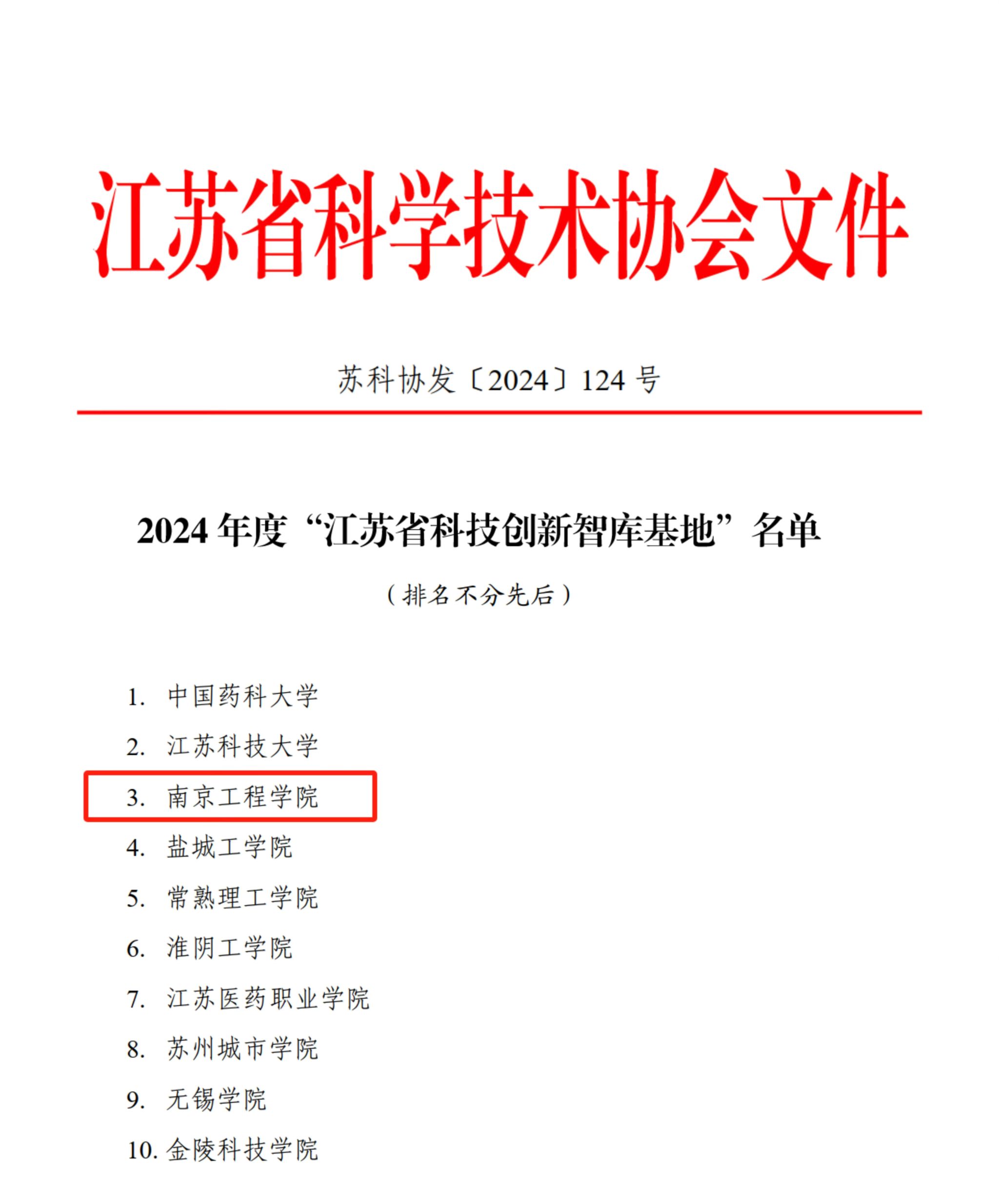 近日,江苏省科协发布《2024年度“江苏省科技智库计划(基地)项目”立项的通知》(苏科协发〔2024〕124号),认定我校为2024年“江苏省科技创新智库基地”,这是继2021年我校首次获批以来再次获批这一省级智库基地。