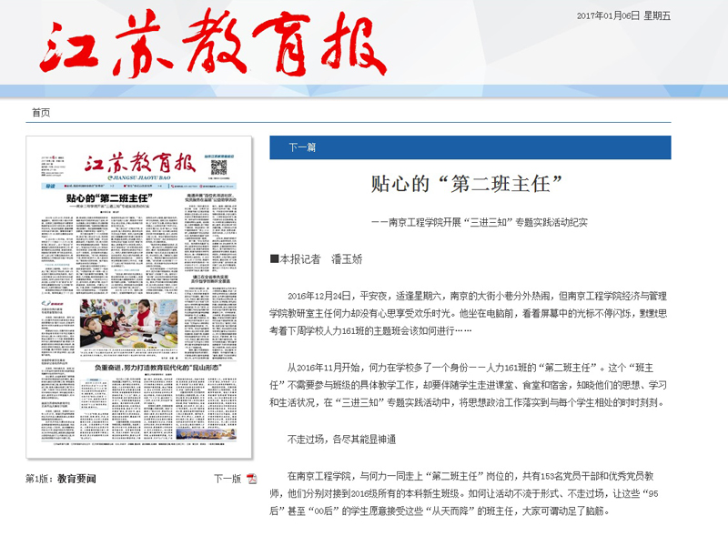 1月6日,《江苏教育报》头版头条以《贴心的“第二班主任”——凯发k8官网开展“三进三知”专题实践活动纪实》为题,再次把报道视角伸向我校。文章从“不走过场,各尽其能显神通;真心投入,用诚心换取实意;机制保障,将思想工作落实做细”三个部分,详细讲述了我校“三进三知”专题实践活动开展过程中的暖心故事。报道全文如下: