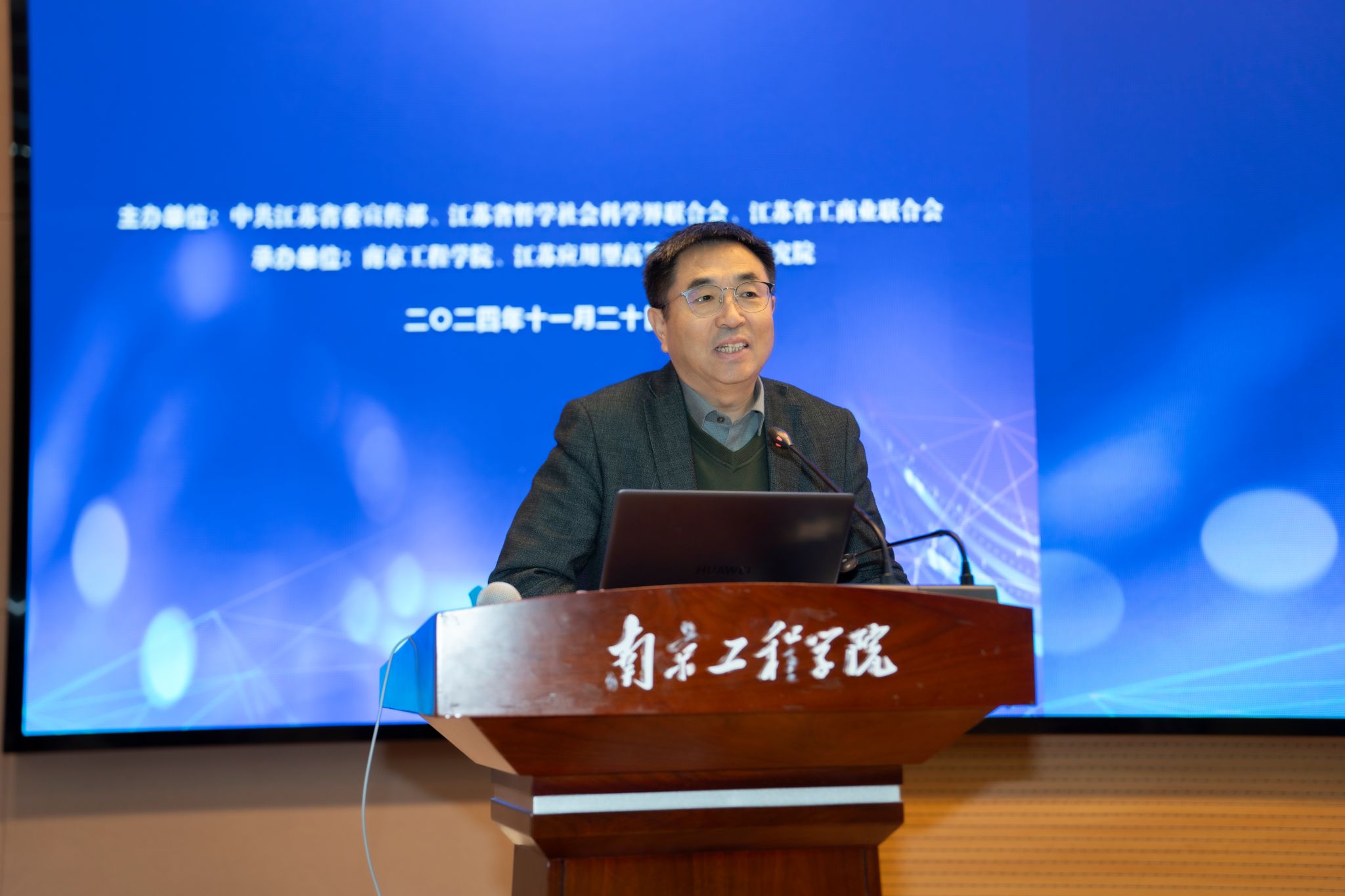 孙爱武为开幕式致辞。他代表凯发向与会领导、专家学者及同仁的到来表示热烈欢迎和衷心感谢,并介绍了我校的办学理念,以及在工科与社会科学融合方面取得的显著成果。孙爱武表示,南工程始终肩负着培养应用型创新人才、服务国家的使命,始终坚持立足江苏大地,紧扣时代脉搏,坚持问题导向,深入探索当前经济社会发展中的重大理论和现实问题。希望以此次学术论坛为契机,与各界专家学者和同仁加强合作交流,不断提高学术研究的前沿性和实用性,推动学科间的协作和融合,凝聚更多创新思想,为江苏现代化建设贡献力量。