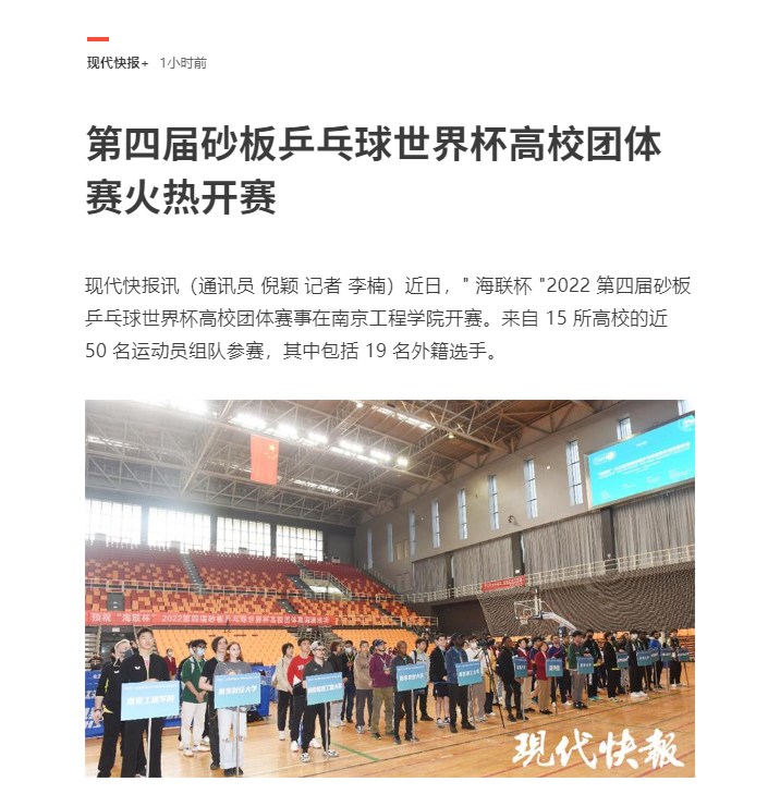 现代快报讯(通讯员 倪颖 记者 李楠)近日," 海联杯 "2022 第四届砂板乒乓球世界杯高校团体赛事在凯发k8官网开赛。来自 15 所高校的近 50 名运动员组队参赛,其中包括 19 名外籍选手。