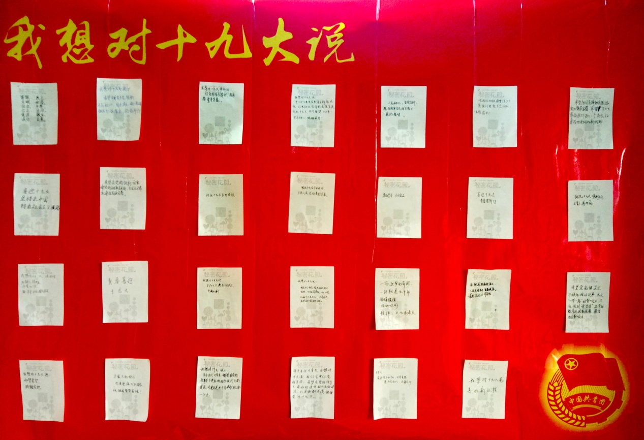 环境152、电环171、水质171等团支部共同发起“心系十九大?心语心愿”活动,话题一经发出,就引发了广大团员的热烈讨论和广泛参与,青年学生们在心愿墙上写下对党的祝福、对党的十九大的祝贺。环境152团支书席肖同学这样写道:“习近平总书记讲到我们进入新时代的话语鼓舞人心,心中的国家自豪感无比高涨,我为中国骄傲。”100多名青年学生以书写祝福的形式,用心写下对祖国母亲、对党的祝福和对自己成才发展的规划,把自己的个人发展与国家发展变化相结合,深情歌颂共产党,以实际行动迎接新时代,祝福十九大。